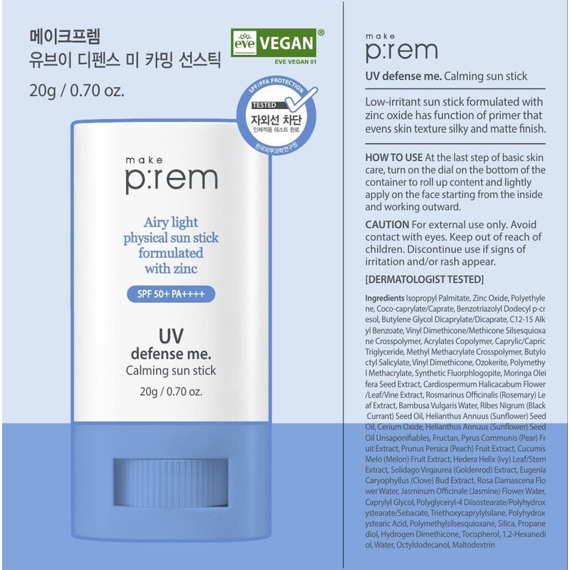 MAKEPREM UVA UVB Defense Me Calming Sun Stick Sunblock SPF 50+ PA++++ 0.7 Oz VEGAN Sensitive Oily Acne-Prone Skin Reef-Safe Mineral Sunscreen Non-Nano No Chemical UV Protection Non-Greasy Sticky Kids