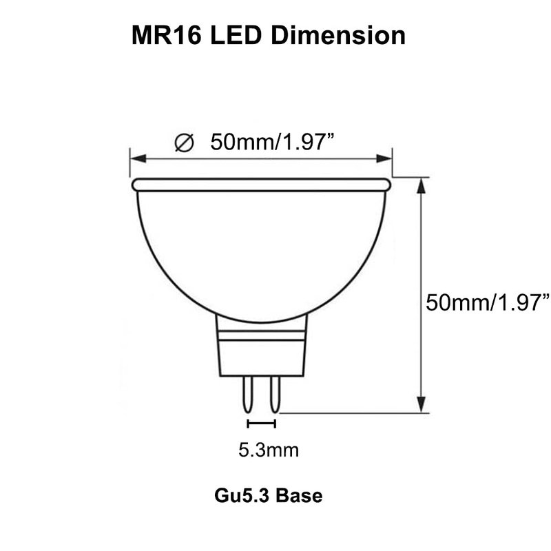 - Gu5.3 Bi-pin base. Easy installation. Plug and play. Standard MR16 Size(1.97"(W) x 1.97"(L). It is easy to fit into the existing fixtures. If you need smaller MR11 Size(diameter 35mm/1.37inch), please search the ASIN: B077XV1QGP