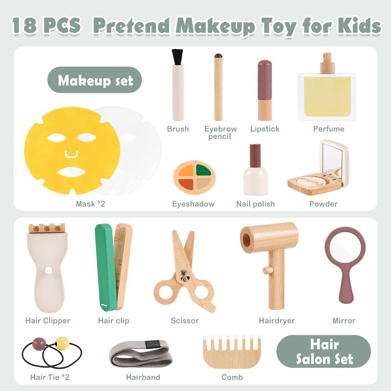 - Fun Wooden Makeup Kit: Girls love to imitate their mom apply makeup! The makeup toy playset includes makeup and barber tools, such as mask, powder, eyebrow pencil, nail polish, lipstick, hair dryer, comb, hair clipper, mirror and more. From pretend princess parties to magical makeovers, the set sparks endless opportunities for imaginative play.