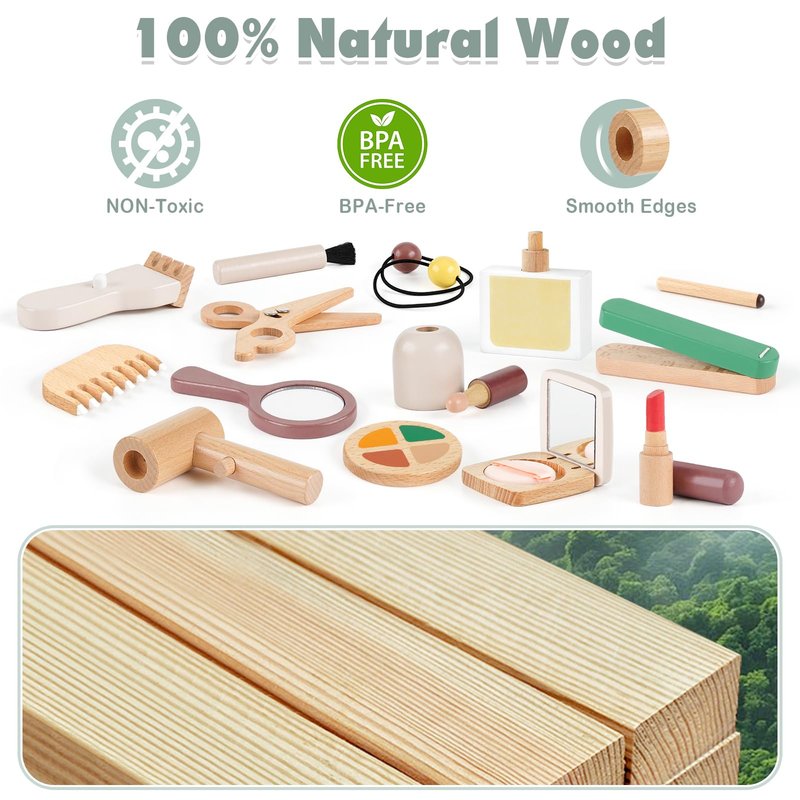 - High-quality Material: We ensure the highest quality for every piece in our toddler makeup set. The toy design uses fresh and elegant Morandi colors, natural wood texture, polished and smooth, suitable for children's size design, non-toxic water-based environmentally friendly paint, colorless and odorless, ensuring a safe and enjoyable play experience for your child.