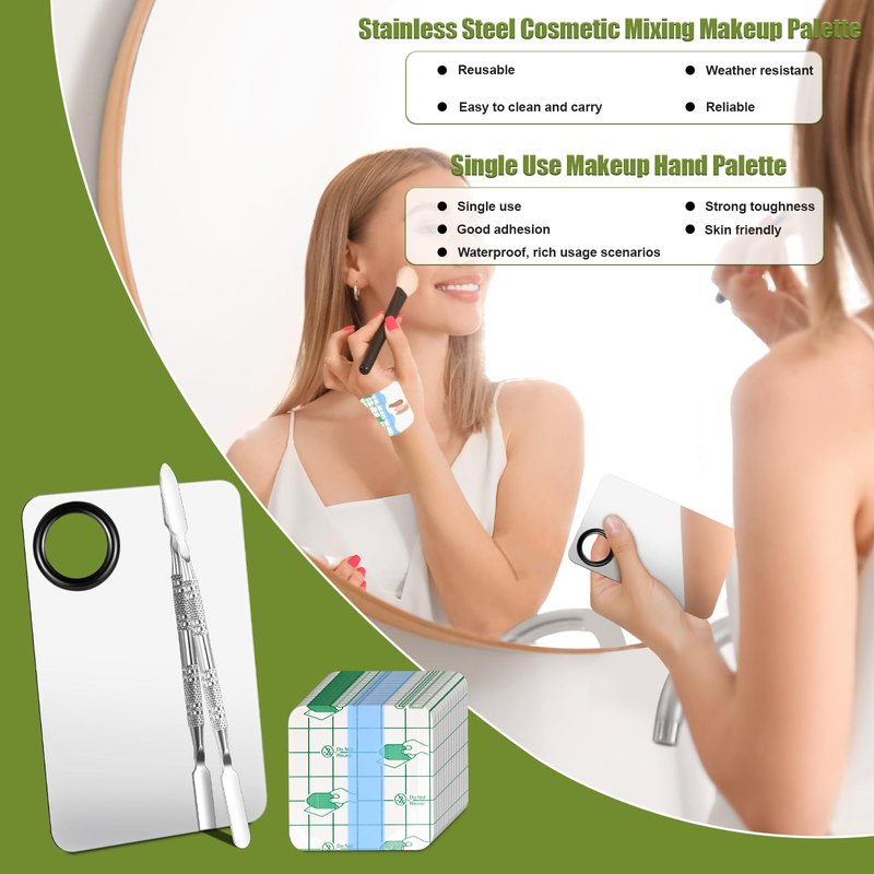 The set includes both stainless steel makeup blending palette and disposable adhesive palettes, which are a perfect combination of hygiene and convenience.