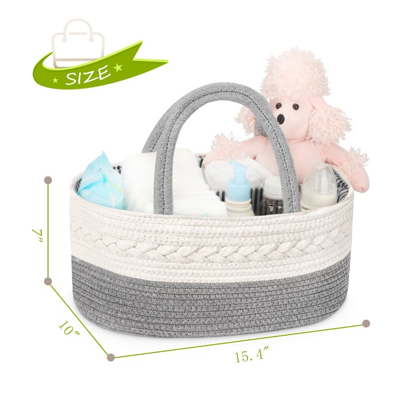 - X-Large Size Diaper Caddy- This baby basket is large enough for parents to keep your baby's wipes, diapers, and other necessities in perfect order and handy, giving you instant access to all your baby stuff when you are in a hurry; Size at 15.4"L * 10"W * 7"H