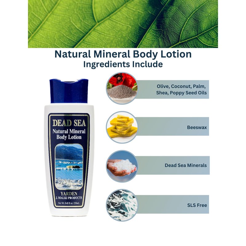 Experience the ultimate hydration and nourishment with our Dead Sea Mineral Body Lotion – a vegan-friendly, SLS-free formula enriched with natural minerals. This nourishing moisturizer is a life saver for dehydrated skin, replenishing lost moisture and improving tone and elasticity. Crafted with care, the non-oily formula ensures easy absorption, leaving your skin feeling soft, refreshed, and radiant without any greasiness. Key minerals like Potassium actively replenish moisture, while Chloride works to enhance skin tone and elasticity. Indulge in a skincare ritual that not only hydrates but also promotes healthier-looking skin. Suitable for vegans, our body lotion is formulated to provide deep hydration and a natural glow. Elevate your skincare routine with the Natural Mineral Body Lotion – where hydration meets the goodness of Dead Sea minerals for a radiant and revitalized you.