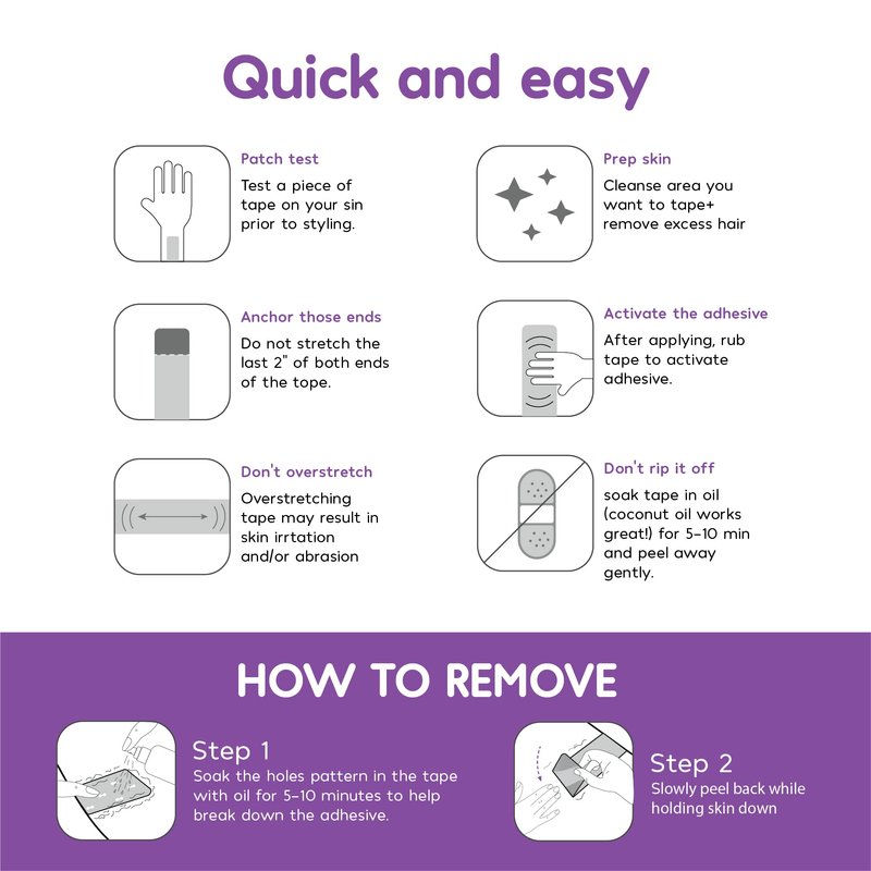 - FOR ALL SKIN TYPES: Our latex-free fabric is designed to be breathable and gentle on the skin, making it ideal for individuals with sensitive skin. To remove the tape, apply baby oil into the holes, wait ten minutes, and then gently remove the tape.