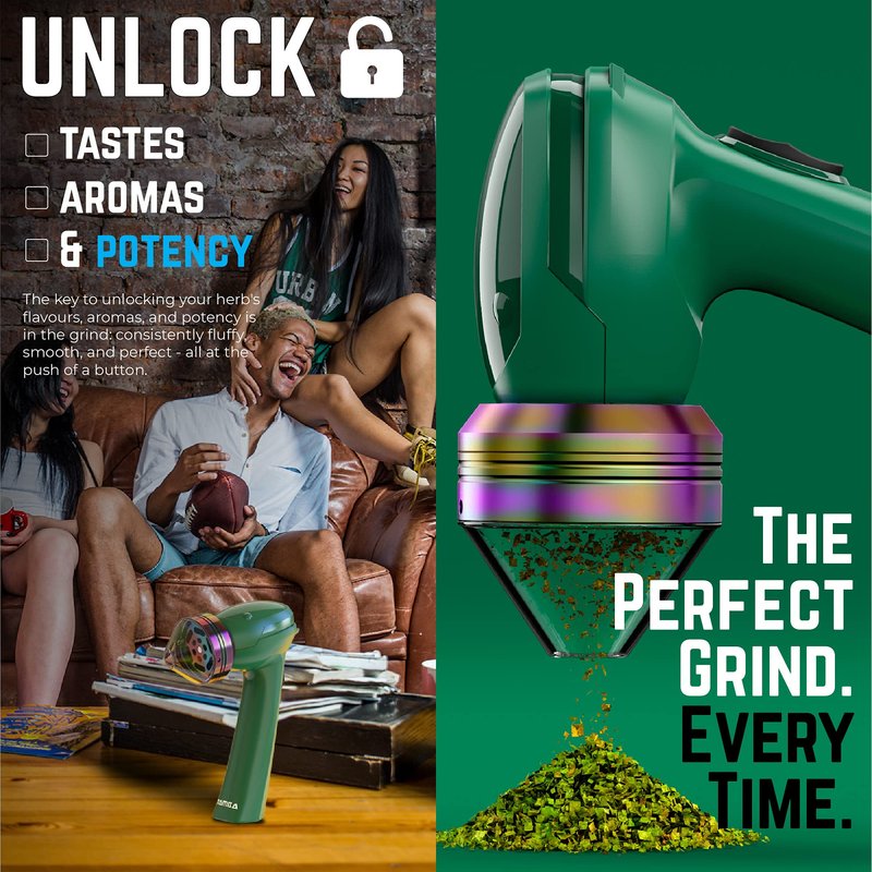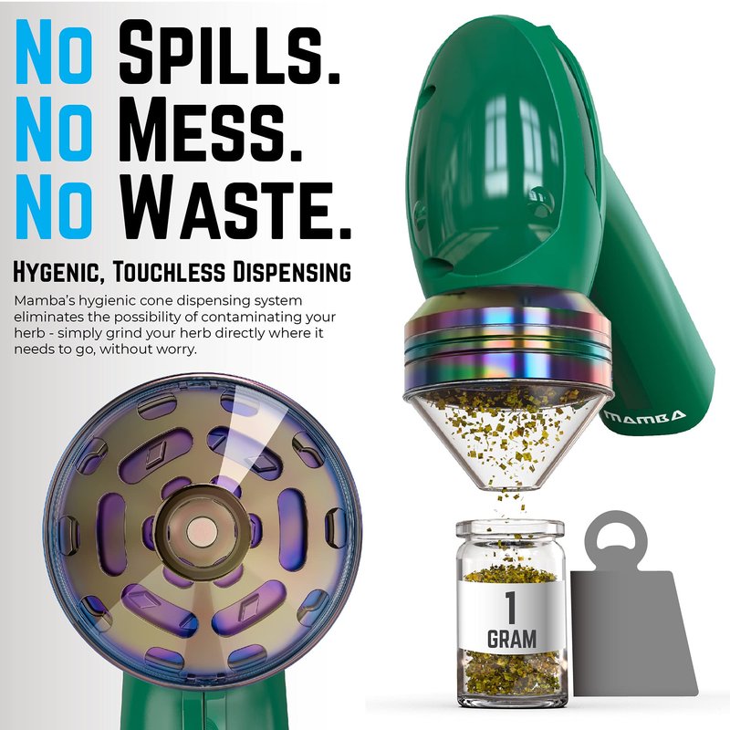 No matter how leafy, mossy, sticky or oily that herbis, the Mamba Electric Grinder gets its powered teeth straight into the job and delivers as much or as little as you load. With a medium-fine fluffy grind every time, its clear-cone pouring spout delivers material accurately with no contamination, annoying spills or wastage of expensive product