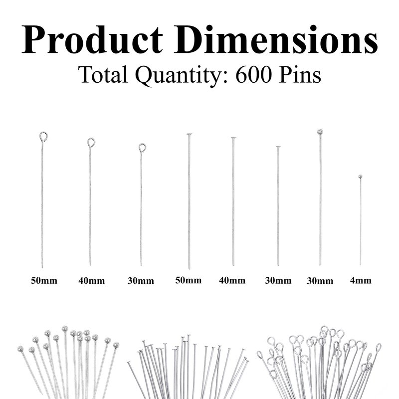 - Eye pins for jewelry making bulk assortment; 8 assorted pin styles; Quantity: 600 PCS; 30mm and 40mm eye pin and head pin: 100 PCs each size: 50mm eye pin and head pin: 50 pcs; 30mm and 40mm ball head pins: 50 pcs each Size; Wire Gauge: 22 gauge or 0.64mm