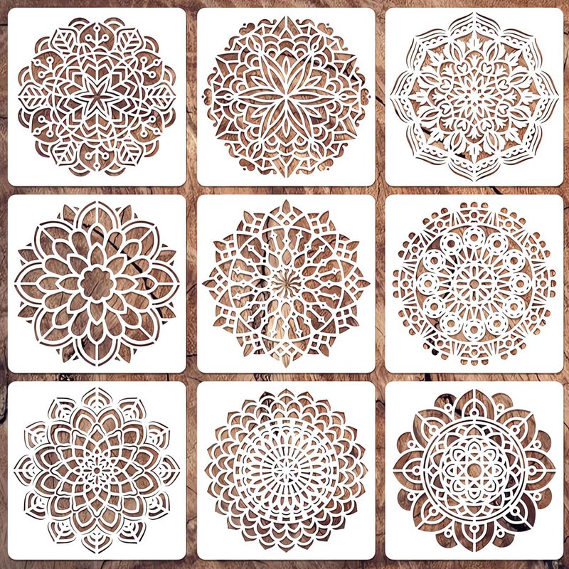Mandala Stencils for Painting on Wood, 9pc 6 Inch Plastic Reusable Stencils for Crafts, Rangoli & Home Decorating