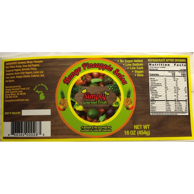 Mango Pineapple Salsa has a great sweet flavor that goes great with Tortilla Chips and also on Salmon, Shrimp, Fish Tacos, can be used in a Stir Fry, or on Chicken Breast, & Roast Pork. A Portion of the Proceeds are Donated to Veteran Charities.