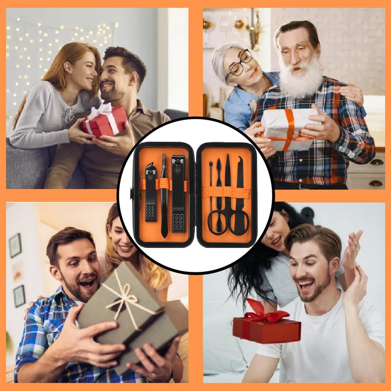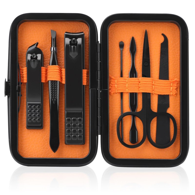 - [Men Women Manicure Set] With a unique black + orange color scheme, this nail clipper set is suitable for both men and women. Multifunctional travel manicure set includes hand care,facial care,foot care tools(Contains large nail clippers, small oblique nail clippers, eyebrow scissors, eyebrow tweezer, ear pick, nail file, nail cleaner, portable travel PU case).