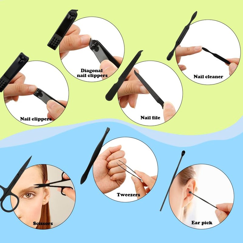 - [💅8 IN 1 PERSONAL CARE SET💅] This nail set with a leather case, contains 7 nail tools that can be used for hand care, foot care and facial care. Nail clipper, diagonal nail clipper, nail file, nail cleaner can be used for hand care and foot care. Scissors, tweezer, ear pick can be used for facial care. Multiple functions of personal care tools all in one case. You don't need to pay for any single nail tool! This 8-in-1 grooming kit fits your personal care needs perfectly. nail care