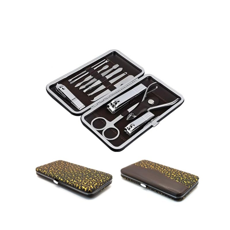 The 12-piece manicure and beauty kit includes: Large nail clippers: strong grip, trim hard and thick toenails Medium nail clippers: trimmed small and medium nails Diagonal nail clippers: trim the corners of the nails and remove the corns Nail file: polish the manicured nails and smooth the edges of the nails Dead skin pliers: used to trim the surface, calluses, dead skin Dead skin push: V-shaped cutting edge, push and scrape the dead skin around the nail Double-end cleaning knife: the head is smooth and the dirt on the edge of the nail is removed Scraper: essential for manicure, shave nail polish and thick nails Ear digging spoon: rounded spoon head, comfortable and not hurt the ear Eyebrow scissors: the design of the radian trimmer makes it easier to trim Eyebrow clip: elastic design, high occlusion, easy to remove small hair Acne needle: the needle pricks out the acne, the steel ring squeezes the acne