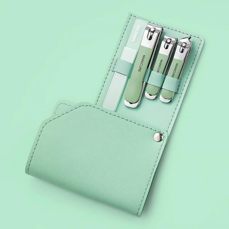 - Elegant Look : The nail clipper set comes with a synthetic leather case that simply opens with a swivel; the case is soft to the touch and lightly padded inside to securely hold the beautiful mint green nail care kit inside.