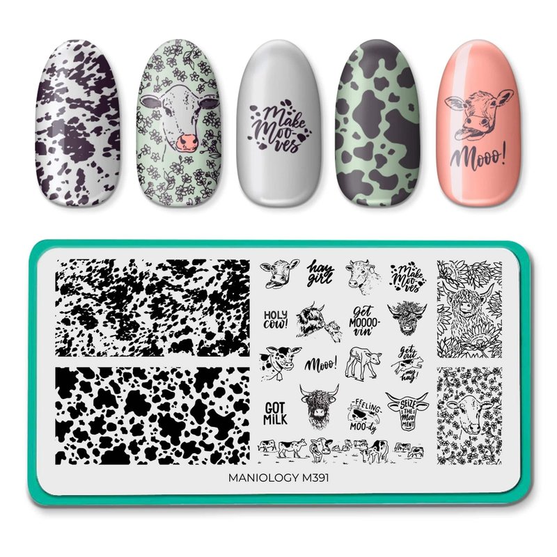 Moo-ve over boring nails, it's time to get creative with our Moo-velous (M391) stamping plate. This udderly charming plate is filled to the brim with cow-inspired designs that will make your nails the moo-st stylish in the barn. Featuring a herd of cow-inspired designs like cow spots patterns, adorable cow faces, and more, this plate offers a pasture full of creative possibilities. Get hoofin' with a stylish, moo-tiful mani!