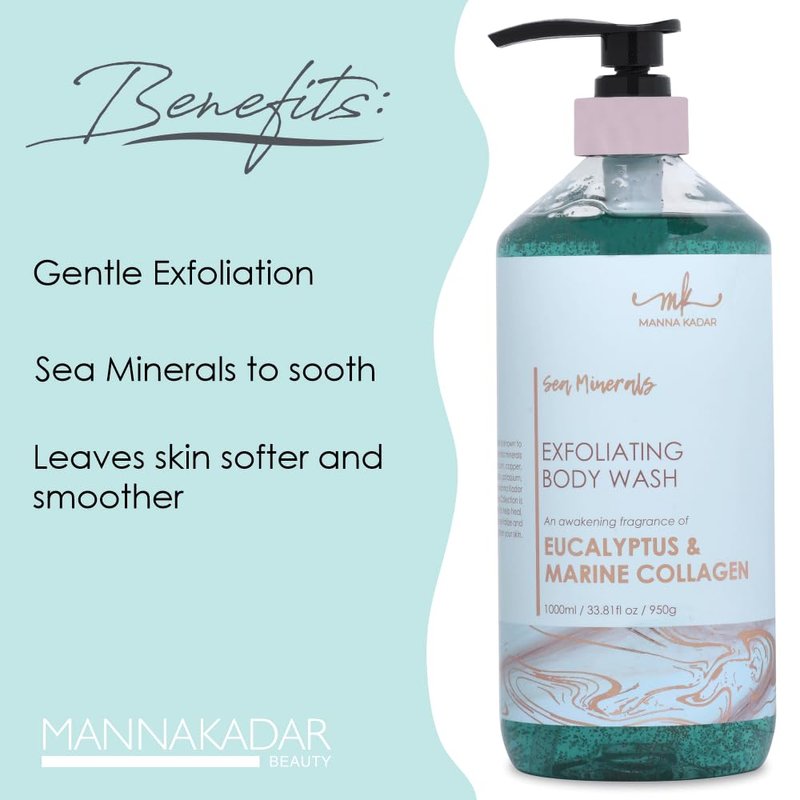 Introducing the Manna Kadar Sea Minerals Exfoliating Body Wash in Eucalyptus Marine. This invigorating body wash is formulated with sea minerals and natural exfoliants to cleanse and rejuvenate your skin.