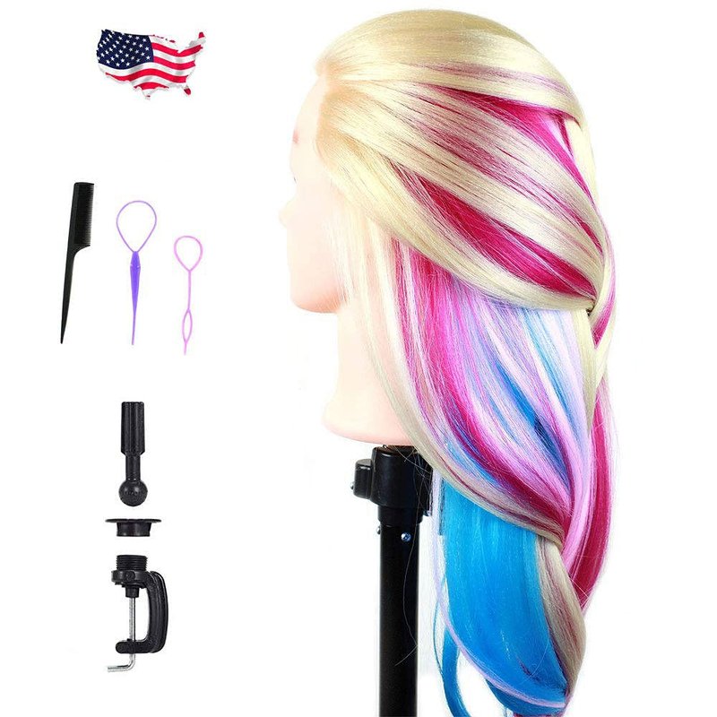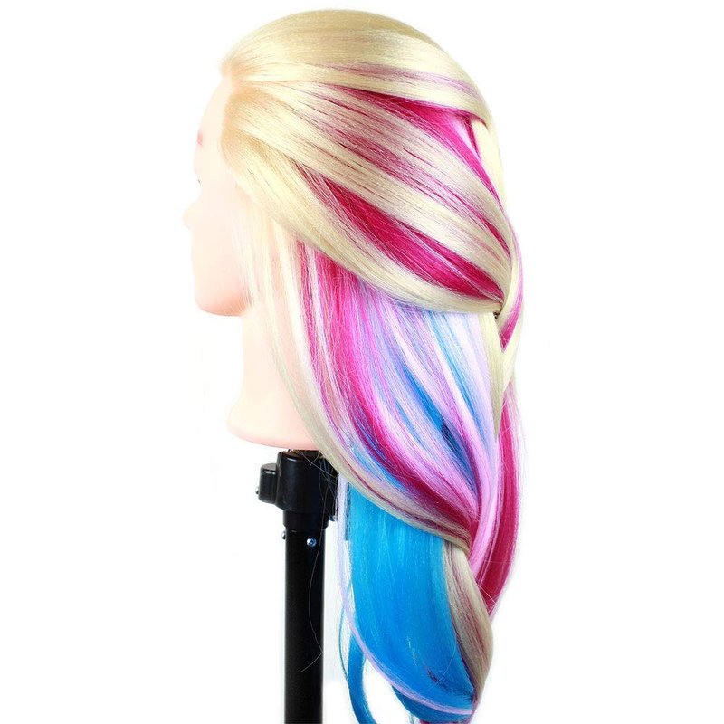 Mannequin Head Manikin Hair Hairdresser Training Head Cosmetology Doll Head (Table Clamp Stand Included) (29" Synthetic Hair, Blonde Red Pink Blue)