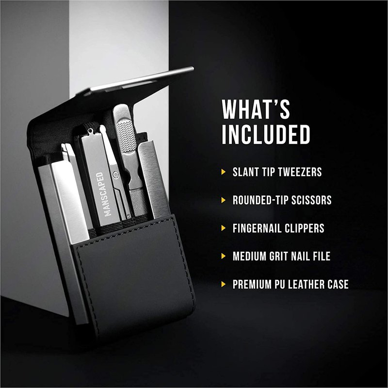 - WHAT'S INCLUDED: Slant-tipped tweezers, rounded point scissors, fingernail clippers, medium grit nail file, in a compact premium PU Leather case.
