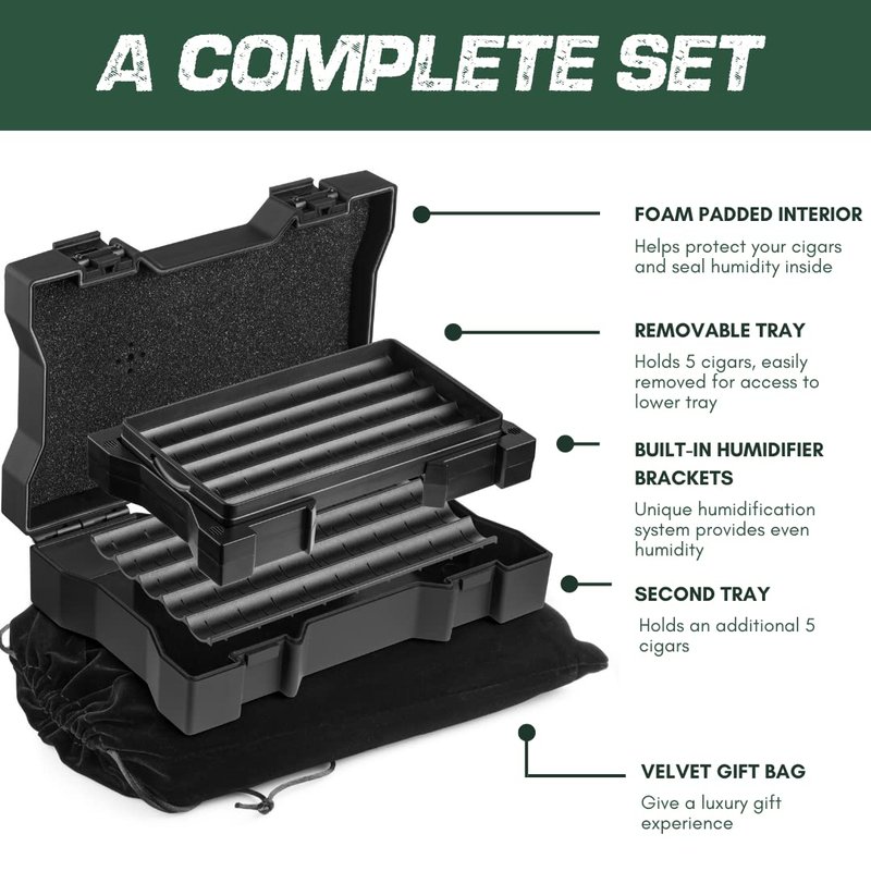 - CIGAR CASE INCLUDES- These travel humidors for cigars include: Cigar travel humidor, 2 inner trays, unique humidifier bracket system, built-in outer hygrometer and giftable box and velvet gift bag.