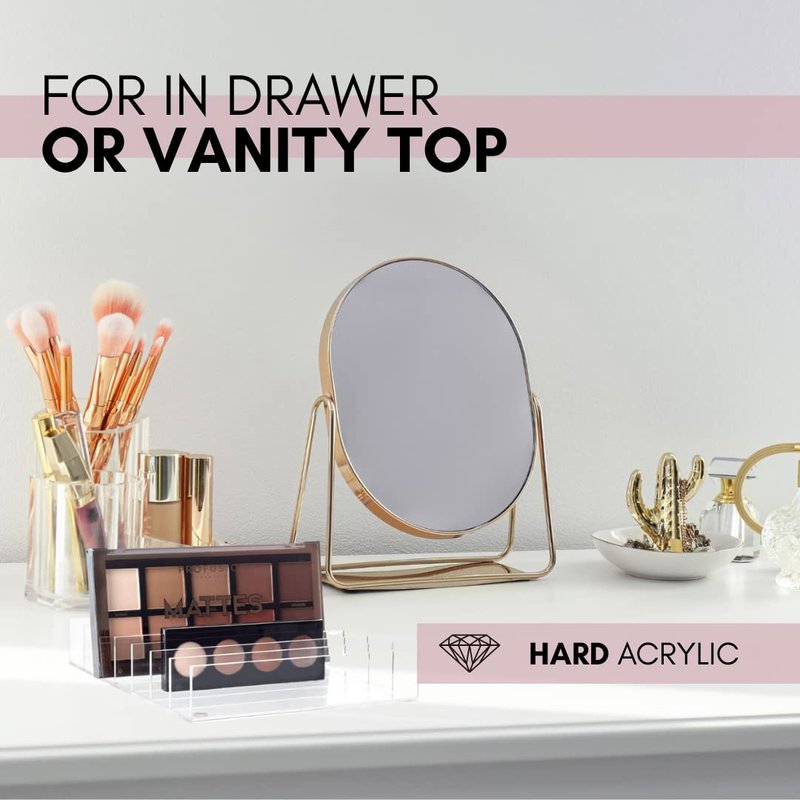- IN DRAWER OR TABLETOP- The makeup pallette organizer can be used freestanding on your vanity or dresser, or as an in-drawer makeup palette organizer. Keep your palettes displayed in all their beauty or keep them tucked away neatly in your drawer!