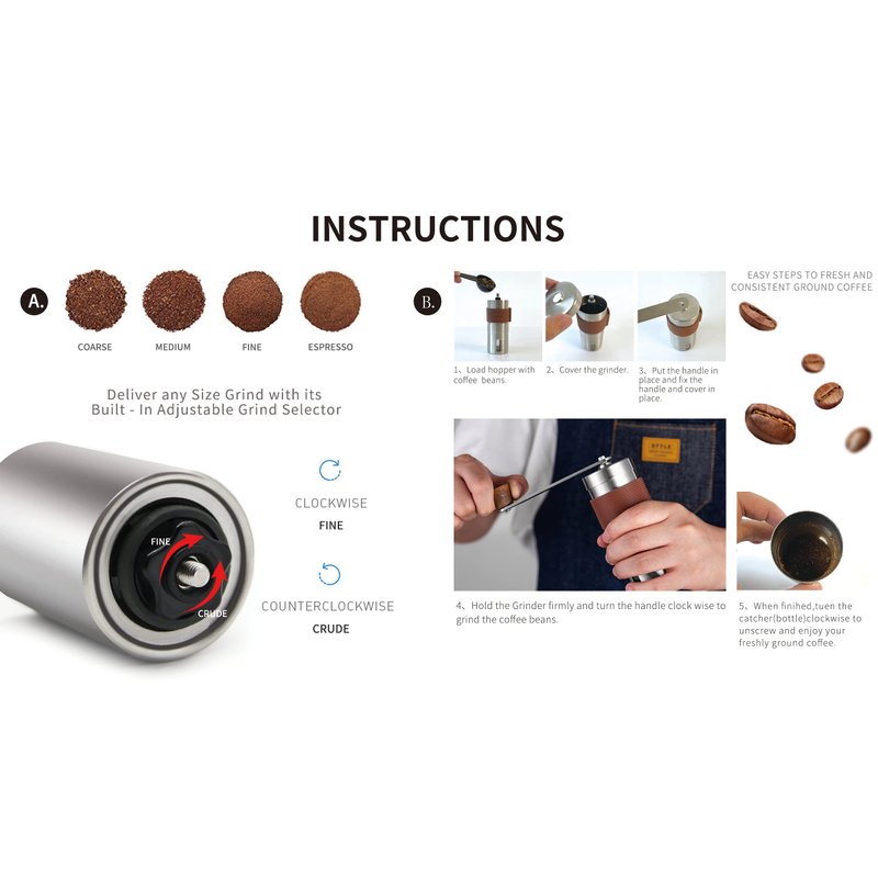 Manual Coffee Grinder, Hand Coffee Grinder, Bean Grinder, Portable Mini Coffee Grinder with Adjustable Settings, Suitable Use for Home, Office and Travel. Stainless Steel.