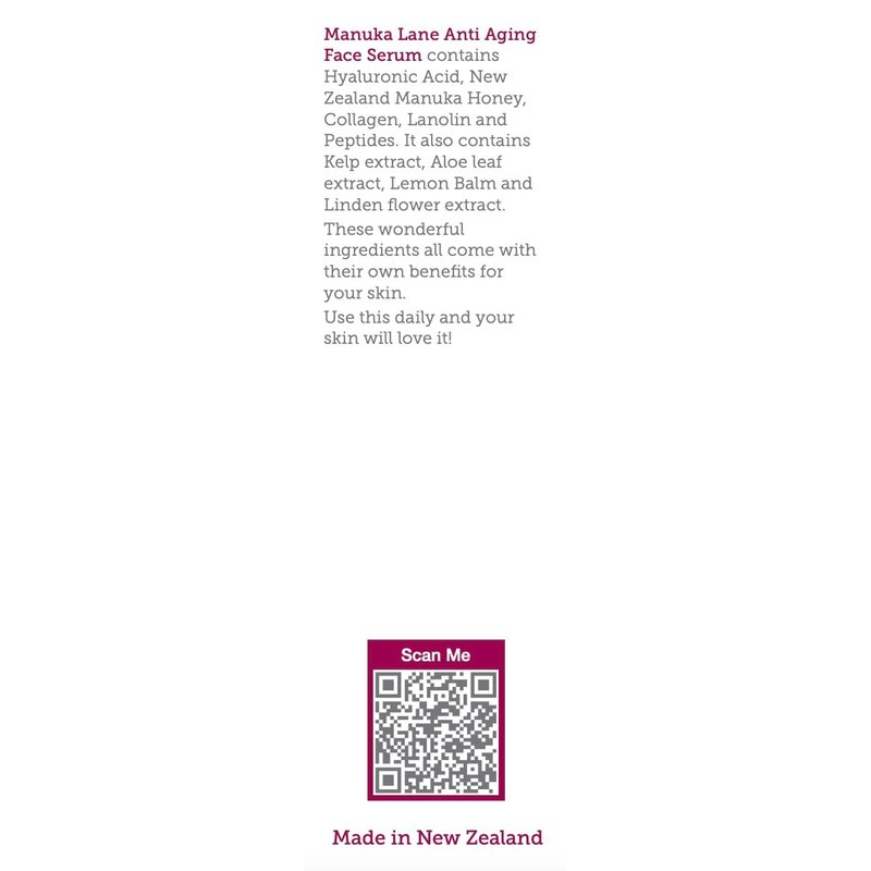 Manuka Lane Face Serum Contains Hyaluronic Acid and Peptides to help reduce the affects of aging. Hyaluronic Acid helps Keep the Skin & Healthy. Hyaluronic Acid helps keep the skin young and healthy. It provides continuous moisture to the skin by binding up to 100 times its weight in water. With age, the ability of the skin to produce Hyaluronic Acid decreases. Manuka Honey has Natural Properties and also is a potent effect, so it soothes inflamed skin while healing blemishes. It also helps balance the skins pH and contains amino acides which slough away dead skin cells helping top keep pores clear. Collagen is responsible for skin strength and elasticity and its degradation leads to wrinkles that come from aging.