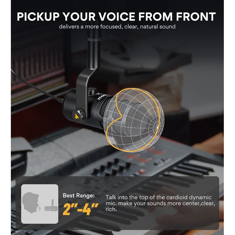 - Effectively Reduce Noise: PD100U USB microphone built -in woven nets and anti -spray sponges, 1 +1 double -layer physical noise reduction to ensure sound permeability, effectively reduce the impact of airflow when recording, the cardioid dynamic microphone accurately pick up from the top of the microphone, inhibit the sounds from sides and back well, make your voice more concentrated, clear, charming. (best pick up range: 2"-4")