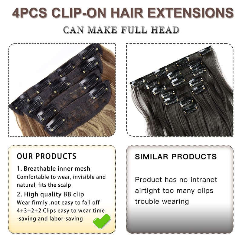 - 💖Great Quality&Highly recommende - This hair extensions are very soft and not overly shiny.The clips are strong and hold well.The clip in hair extensions are extremely well made, not only are these full and beautiful and thick hair but they are so comefortable!They also don't get tangled up as easily as the other ones do.The clips are strong and hold well.The most important is this set does not have any strange chemical smell like many other sets you had before.