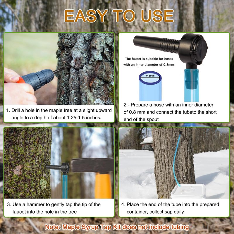 - EASY TO USE: Collecting maple syrup is made easier with the right tools. Our maple syrup tap kit is easy to use, simply drill a small hole in the maple tree with a 5/16" tapping bit, and install the tap in the hole. It will make tapping easier for both professionals and beginners