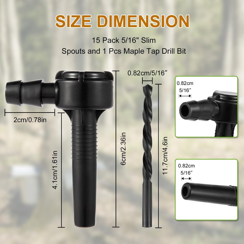 - HIGH QUALITY MATERIAL: The maple syrup tapping supplies are all made of reliable materials; the tree taps are made of tougher textured plastic material, which is more durable and will not break when pulling out.The 5/16" tapping bit is made of high-quality steel material for efficient cutting