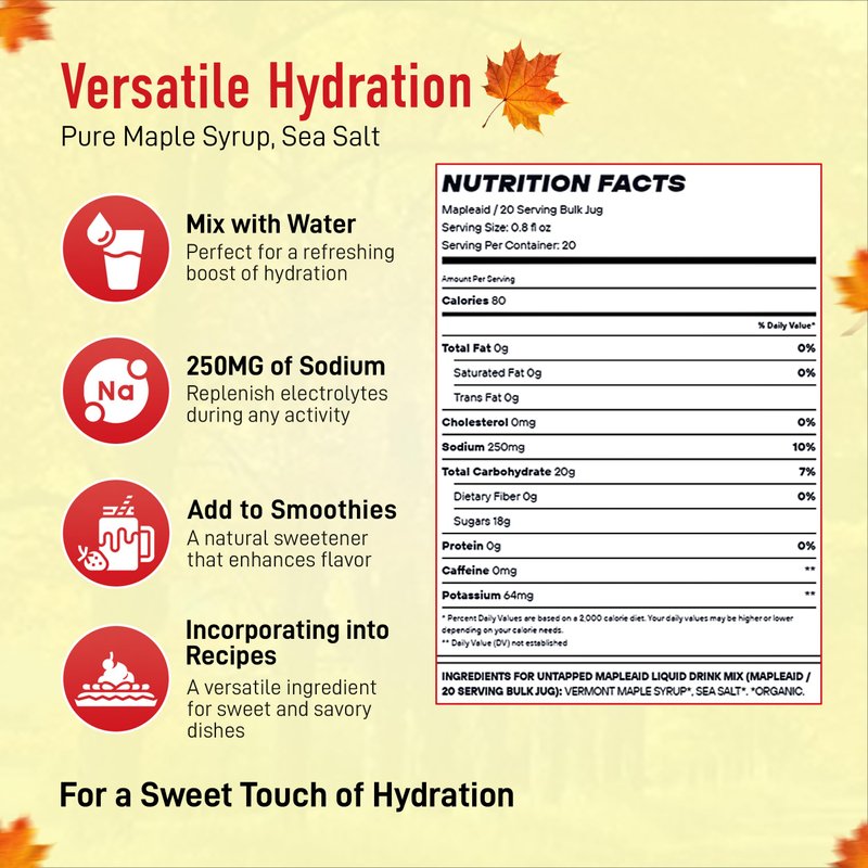 Introducing Mapleaid in a new bulk bottle format – your go-to hydration solution crafted from organic maple syrup and sea salt. Each serving offers 80 calories and 250 mg of sodium, providing a perfect balance of natural sweetness and electrolyte replenishment to support your active lifestyle. Mapleaid is designed for athletes, fitness enthusiasts, and anyone who values clean, sustainable products. This drink mix is free from artificial ingredients, ensuring you receive only the highest quality, organic hydration. The simplicity and purity of Mapleaid's ingredients make it not only an effective hydration solution but also a delicious one. Whether you're preparing for a race, tackling a tough workout, or simply staying active, Mapleaid keeps you fueled and hydrated with nature's best. Choose Mapleaid Bulk Bottle for a natural, delicious, and eco-friendly way to stay hydrated and energized, perfectly suited for those committed to maintaining peak performance and supporting sustainable practices.
