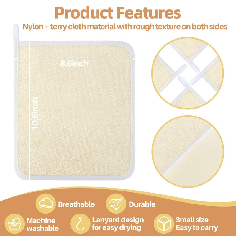 - Ideal Gift】Exfoliating towels are a great gift to give to your family and friends as a gift in any holiday.Different materials on both sides, one side is made of nylon which is rougher, and the other side is made of terry towel which is softer, use it in combination.Towel lanyard design is very convenient, wash after use, hang anywhere and wait for drying can be used again.Let them enjoy the bath, clean skin, relieve fatigue, better stretch and relax.