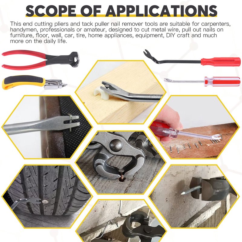 - 【Package Information】In nail removal tool set, You will get a 1 pcs 7” end cutting pliers, 1 pcs staple remover, 1 pcs tack lifter, tack puller, totally 4 pcs. Ideal for your everyday needs at home or for work. suitable for maintenance and repair of furniture, floor installation, housing construction and more.