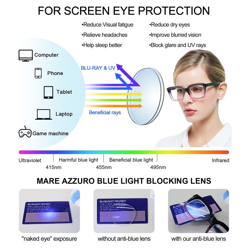 - Comfort: MARE AZZURO reading glasses are crafted by high quality materials, HD magnified lenses, well-designed and hand-made to ensure a all-day comfortable fit. With flexible spring hinge, won’t pinch your face, with firm screws not easy to break. Full ergonomic temples and non-slip one-piece nose pad, no pressure, no red marks.