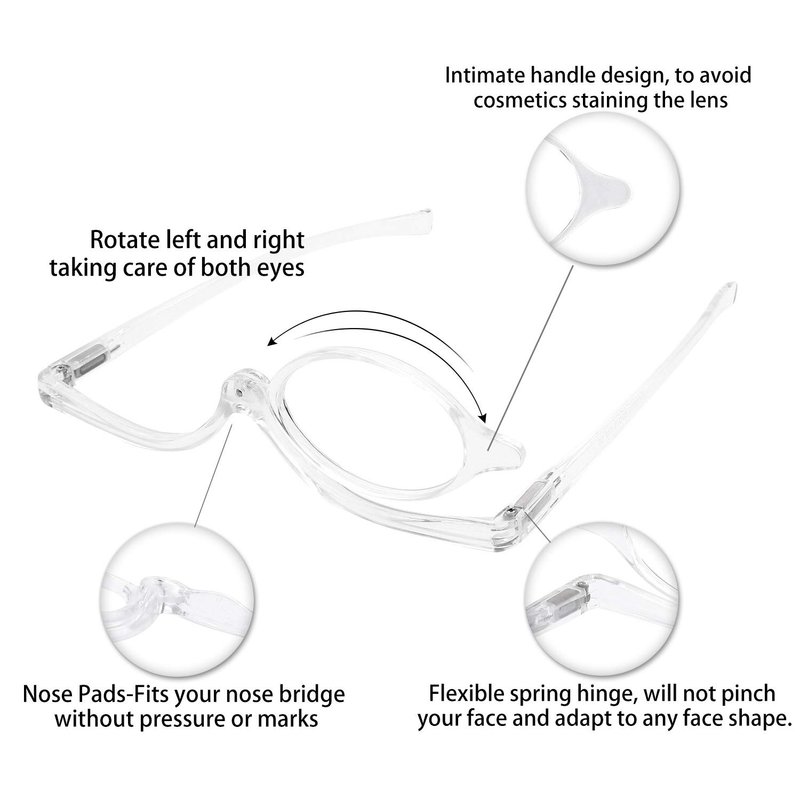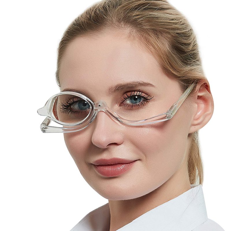 - DESIGNED for MAKEUP: This flip down reading monocle to use cosmetic easy. when you try to masquerade your left eye, you can switch the lens to your right, for right eye switch left. Note: This is only makeup glasses, not daily reading glasses. And please take off the glasses and then switch the lens left and right to avoid damaging the makeup during the rotation.