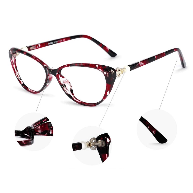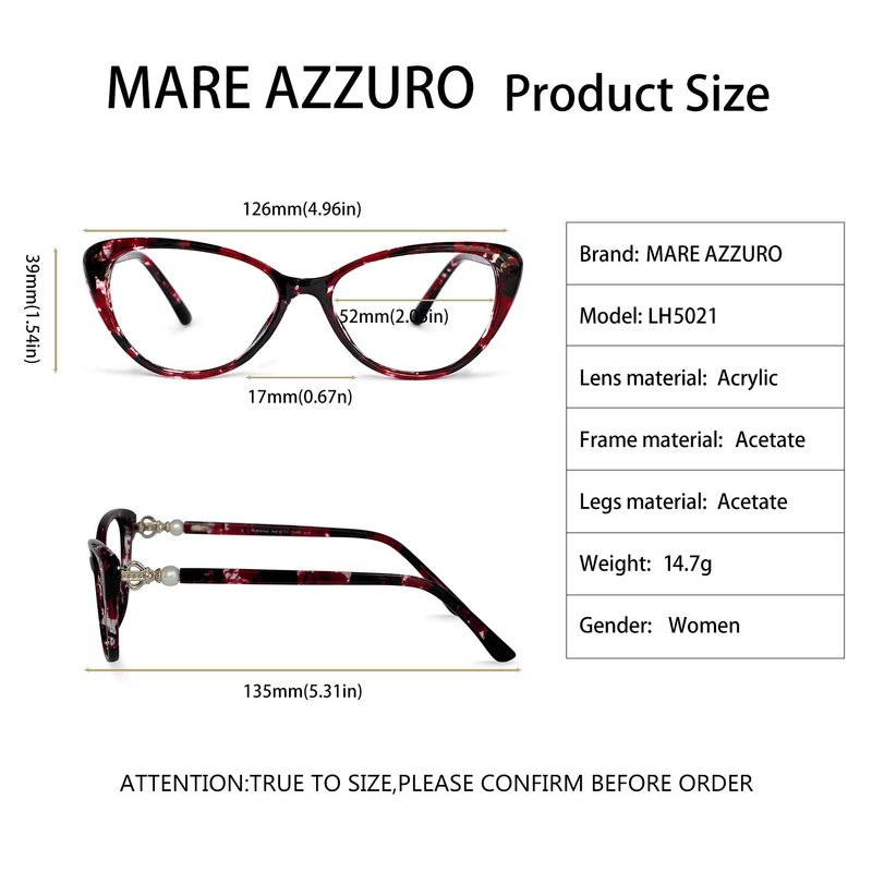 - SIZE:Lens width:52mm(2.05in),Bridge:17mm(0.69in),Arm:135mm(5.31in), Frame width:126mm(4.96in),Frame height:39mm(1.54in). DESIGN: Glossy pearls and beautiful crown on the temples and thhe frame is vintage cateye shape.IT is a retro aesthetic design. There is a spring hinge on the temples, which can be worn even with a big face.