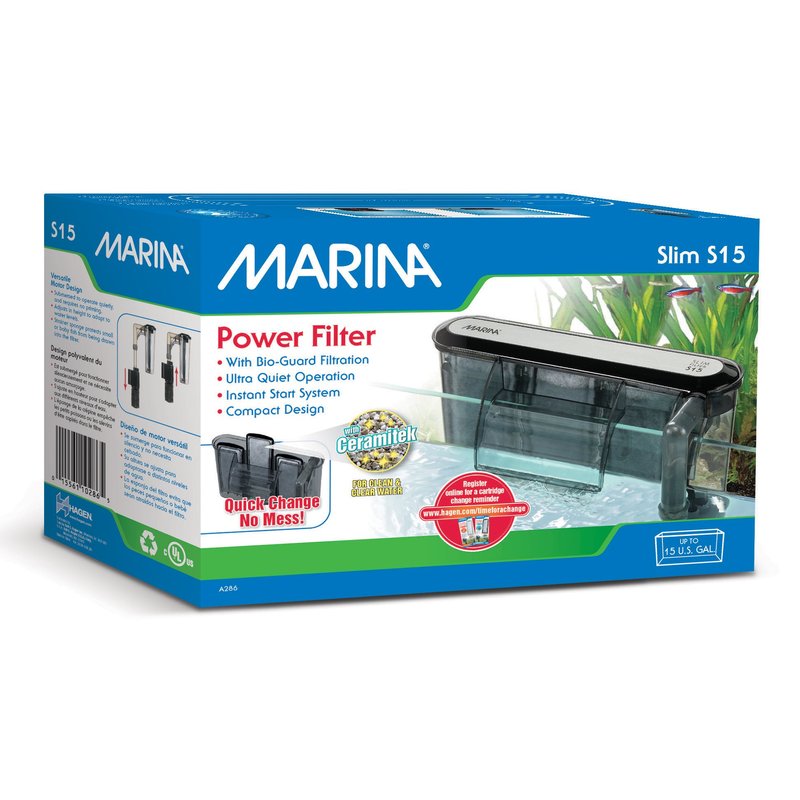 - Efficient Filtration: The Marina Slim S15 Power Filter's unique compact and slim design provides both practical and aesthetic benefits: it takes up less space than standard size filters and it brings a touch of elegance to your aquarium.