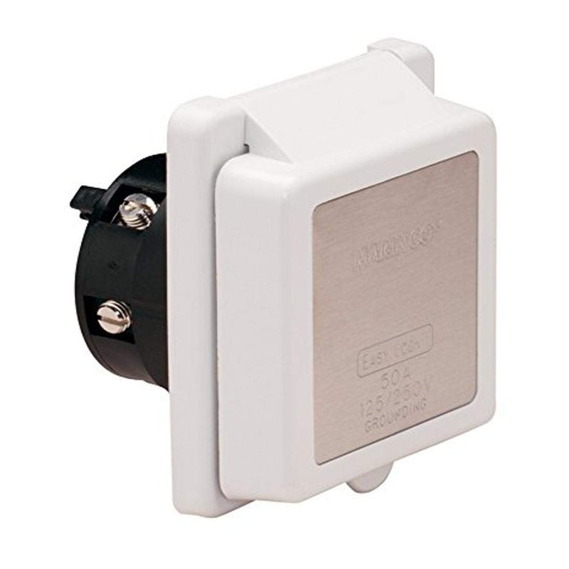 - 50 Amp 125/250V, square, white with stainless steel trim power inlet without rear safety enclosure