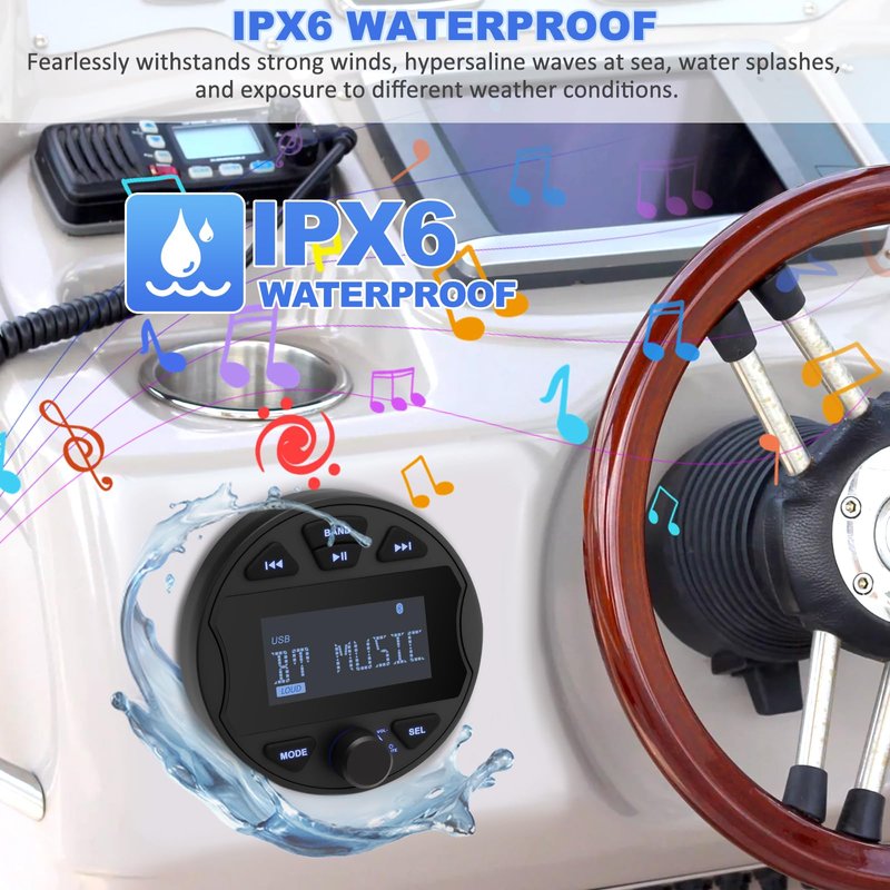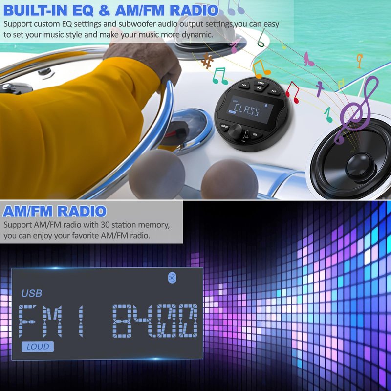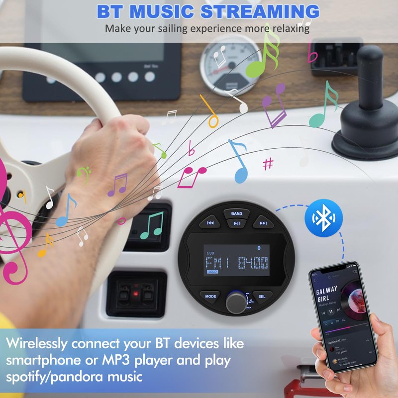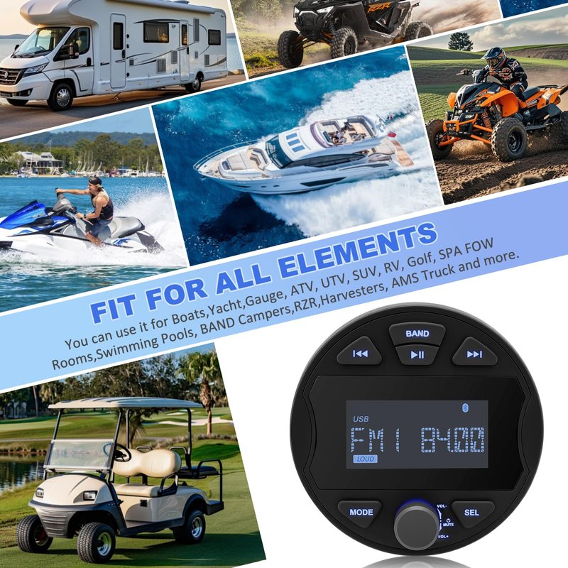 - MULTI-MODE PLAYBACK: Our marine stereo systems for boats play music via the BT, AUX input, USB port for various audio playback formats or tune into the AM / FM radio stations for up to date music/news/sportsthe latest weather conditions and enjoy your favorite radio stations and more. Ensuring flexible and varied entertainment options. Perfect for use in cars, boats, ATVs, motorcycles, and RVs