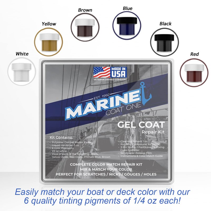 - Professional-looking DIY repairs to save you money and time - Marine Coat One gel coat repair kit is easy to apply. Match your boat’s color with our six quality tinting pigments. Pigment colors include the popular white, black, yellow, blue, red, and brown. Achieve a hard cure by utilizing the included 1 Oz of MEKP catalyst.