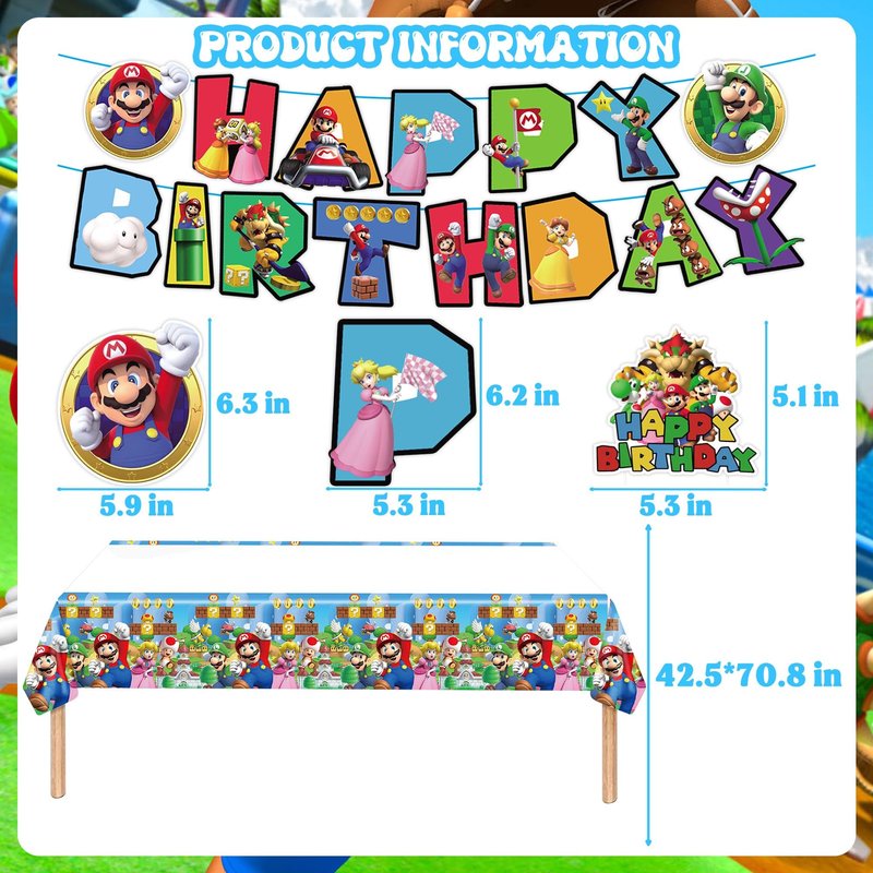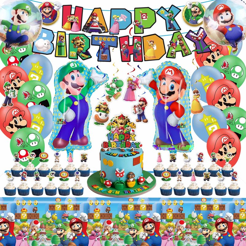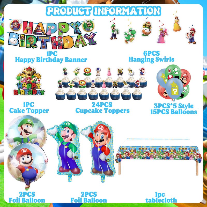 - [You Will Get]: 1 set Happy Birthday banner, 6pcs hanging swirls, 15pcs latex balloons, 2pcs Super Mario foil balloons, 2pcs round aluminum foil balloons, 1pcs cake decoration, 24pcs cupcake toppers, 1pcs tablecloth