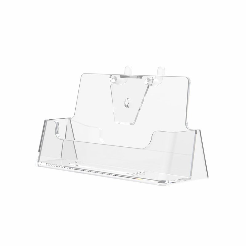 Pegboard Business Card Holder Product Features: Holds standard 3.5"W business, rewards, appointment or gift cards. Pocket Dimensions: 3.5”W x 2"H x .75”D Pocket Capacity: 50 standard sized business cards or 30 gift cards Overall Dimensions: 3.75”W x 2.5”H x 1.25”D Pegboard single pocket business card holder. Perfect hanging display solution in gift shops, department and retail stores, libraries and other business locations. Fits most standard pegboard walls. This single pocket peg board business card holder provides a sturdy display for business cards or gift cards that complements any decor. Looking for a convenient way to distribute contact information? Business card holders make spreading the word about the company's staff and professional services a breeze. Just one holder for personal info will ensure that calling cards are arranged neatly. The unique design of these products attaches to standard pegboard wall fixtures without the need for adhesives, tools, or hardware. The card pocket has a design that makes it easy for employees and customers to take one. Pegboards are a unique wall design that allows retailers to set up product displays in interchangeable and efficient ways. This is a wonderful marketing tool because as products and promotions change, the wall can be reorganized. The pegboard wall card rack provides long-term durability in addition to keeping your 3.5 inch by 2 inch printed material neatly in the holder, and can be easily placed on most standard pegboard walls. In addition to business information, the acrylic holders can also be used to display other small media like Security Gate Code Cards, Membership Cards, Appointment Cards, VIP Cards, ID Badges, Security Cards or Gift Cards. Store credit cards are often placed on pegboard walls near the register or checkout stand to increase clientele and expand the customer base. Other times, simple gift cards or doctor’s appointment cards are placed in the pockets. All sizes are approximate. Fits most standard peg walls.