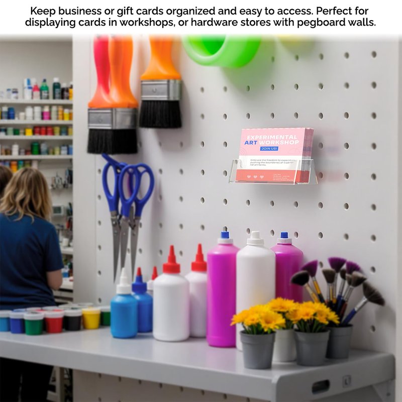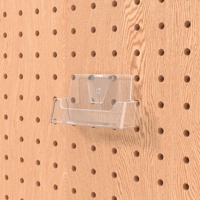 - This pegboard business card holder provides a sturdy display for business cards or gift cards that complements any decor. Looking for a convenient way to distribute contact information? Business card holders make spreading the word about the company's staff and professional services a breeze. Just one holder for info will ensure that cards are arranged neatly. The unique design of these products attaches to standard pegboard wall fixtures without the need for adhesives, tools, or hardware.