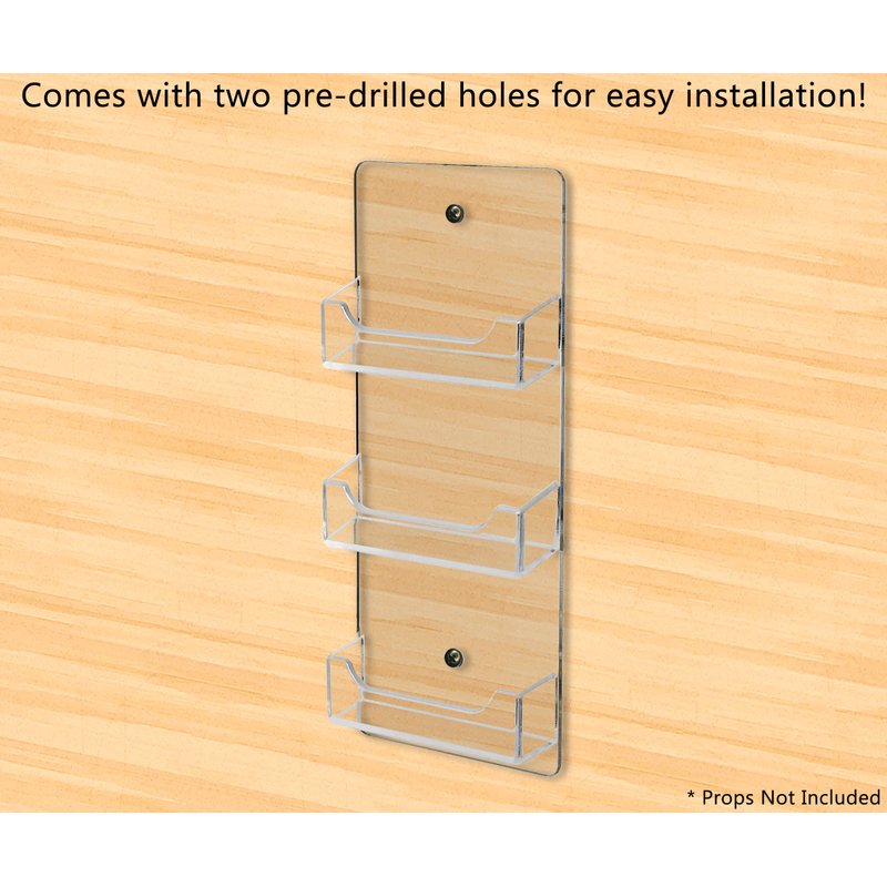 3 Pocket Gift Card Retail Holder Card Vertical Display Contact Wall Mount. Product Features: Holds 3.5”W x 2”H standard sized business cards, appointment, membership, gift or rewards cards. Pocket Dimensions: 3.5”W x 2"H x .75”D. Overall Dimensions: 4.25"W x 7.5"H x 1"D. Pocket Capacity: 50 standard business cards or 30 gift cards. Perfect space saving multi pocket wall mount display holder with pre drilled holes and hanging hardware. This triple pocket space saving wall mount business card holder provides a sturdy display for business, gift or appointment cards that complements any decor. These multi slot card racks are great space savers and help you keep counters free and clear of clutter. Looking for a convenient way to distribute multiple sets of cards in one convenient card organizer rack? Business card holders make spreading the word on the multiple sets of cards simple and easy to access and still appear professional. Just one holder to display multiple sets of printed material and help keep the clutter to a minimum. The appointment card display rack has a design that makes it easy for clients and potential customers to take one. Each pocket can hold up to 50 standard business cards so you will not have to fill them that often. This gift card showcase display is made with acrylic plastic material and made right here in the USA. The wall card rack provides long-term durability in addition to keeping your 3.5 inch by 2 inch printed material neatly in the holder, and can be easily placed on any wall by exits or entrances. We have designed these to display several sets of business cards and can be conveniently placed on walls or anywhere you want to leave your calling cards for the taking. These card holders come pre-drilled for easy hanging and includes hardware. All sizes are approximate.