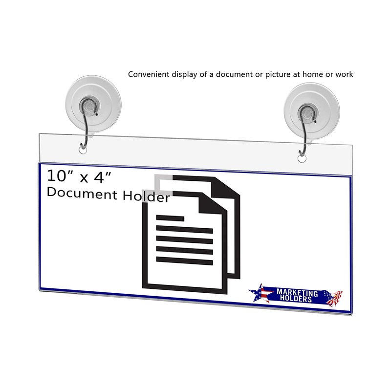 Window Sign Holder 8.75"W x 4"H Display with Suction Cup Hooks Product Features: Holds 8.75”W x 4”H literature Overall Dimensions: 8.75"W x 6.5"H Thickness: 0.080, 5/64", 2MM Perfect hanging display solution for advertisements, nameplates and room numbers in restaurants, bars, retail stores, hotels and other business locations Top or side loading window or glass mount sign holder with suction cup hooks Proudly made with premium high quality materials Marketing Holders clear acrylic sign holder is perfect for displaying signage or posting temporary notices for employees or customers in entryways, glass doors and windowed front desk enclosures. Use them to display signs for special events, sales, store or office hours. Ideal for use at retail stores, restaurants, financial institutions, business offices and more! Our sign holders come with 2 suction cup hooks making it easy to hang up and less of a hassle to install. Simply attach to glass windows and doors for double sided visibility so you can post different messages for incoming and outgoing traffic. Our sign holders are a more professional option to taped notices that lose their stick over time and leave a messy residue on glass walls, doors and windows when the event is over. Made of quality acrylic, this clear holder has a high durability and great resistance. It has smooth edges and is transparent, protecting retail signage from dirt so that the text or image wouldn't be damaged but clear and readable. Easy to use, easy to clean – Each holder has an opening to easily insert your graphic image or message into the sign holder to keep it protected from the elements. Our suction cups adhere best to smooth, non-porous surfaces such as tile, glass or metal. To ensure a firm bond, surfaces should be totally free of dirt and soap film before attaching the suction cups. *All sizes are approximate