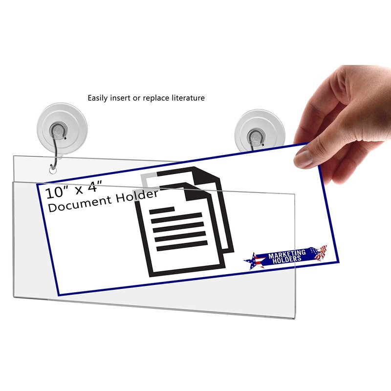- Window or glass wall mounted sign display sleeve with 2 suction cups with hooks for 8.75" x 4" literature