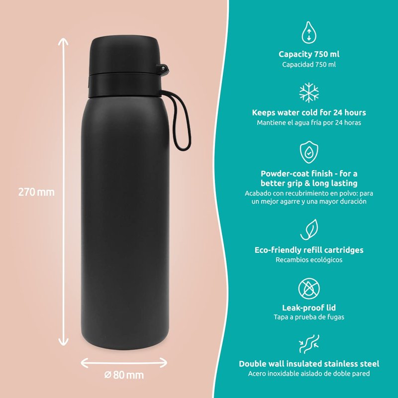 Marley Designed Bottle Pro Reusable Water Bottle with Filter, 80+ contaminants filtered, BPA Free, Sustainable Refills, 750ml, Filter Bottle + 1 Refill Included