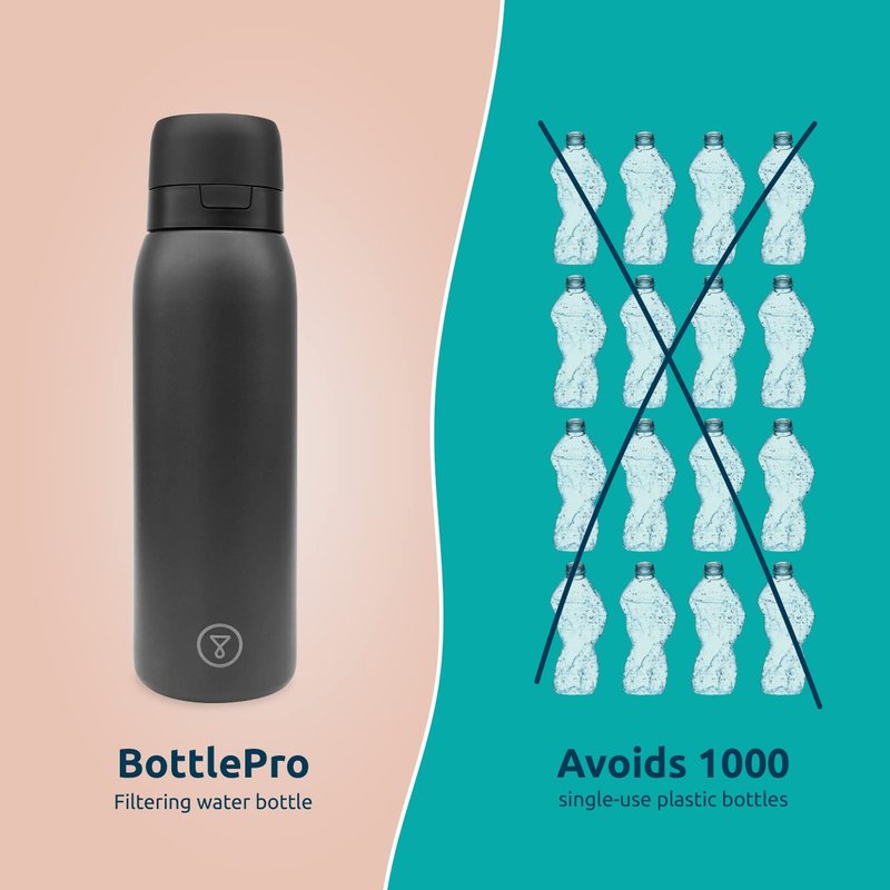 - TESTED QUALITY: BottlePro is a reusable water bottle made of long-lasting, durable, food-grade 18/8 stainless steel. Its portable water filter works with microfiltration and is made of carbon fibre to instantly improve the taste of water by reducing chlorine and particles, even for water from public drinking fountains or the mountains. Designed in Europe and BPA free. In addition, its double wall allows to keep the water cold for 24h.