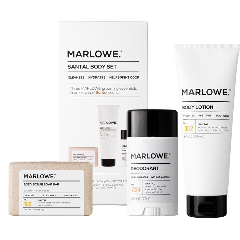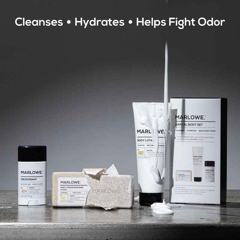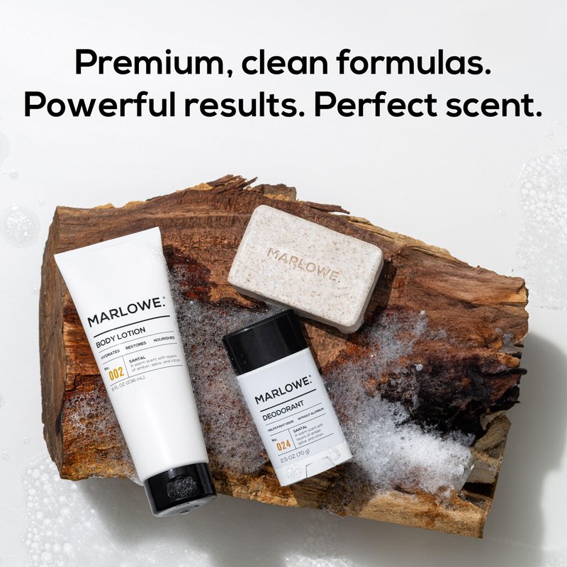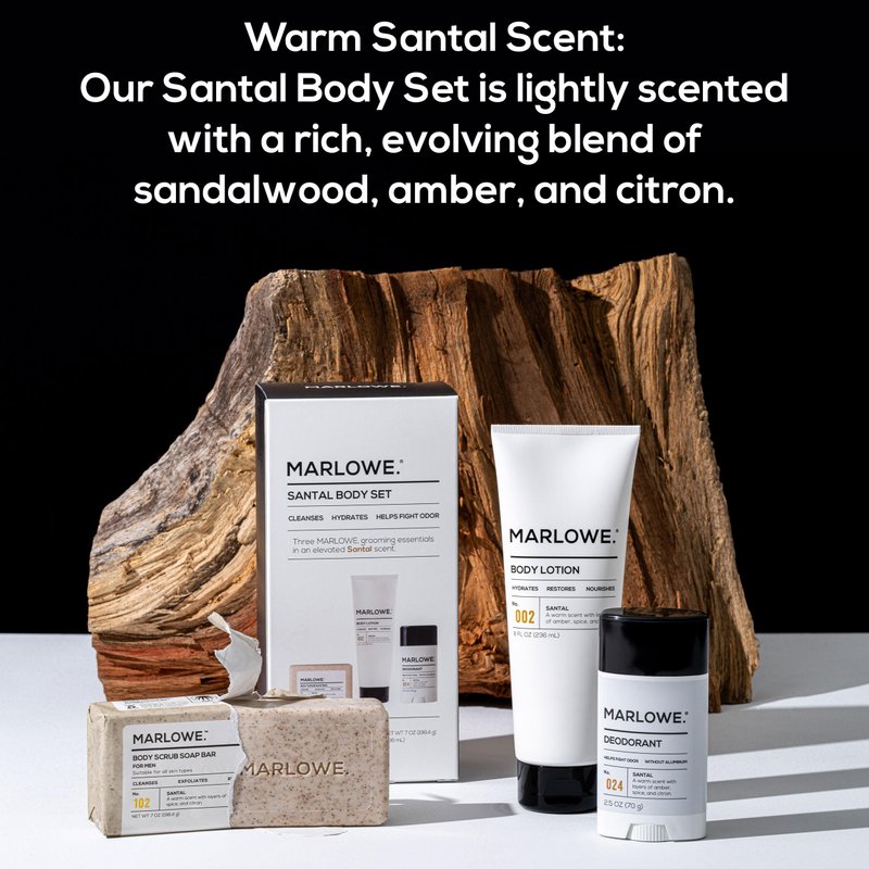 MARLOWE. Men's Body Care Essentials - Santal Body Set Experience luxury grooming made simple with the MARLOWE. Santal Body Set. This premium collection delivers a daily dose of energizing freshness, transforming your grooming routine into an invigorating ritual. Featuring our signature Santal scent, each product works effortlessly to cleanse, and nourish your skin and leave you smelling amazing. The Scrub Bar Soap gently exfoliates, removing dirt and rough patches without stripping moisture, while the deodorant neutralizes odor and wetness without aluminum or baking soda. Our moisturizing body lotion absorbs quickly, helping to deliver deep hydration without any greasy residue. All three feature our signature Santal fragrance – an elevated blend of warm sandalwood, rich amber, and bright citron that evolves beautifully throughout the day. MARLOWE. delivers powerful skincare and grooming without compromise. We formulate without harsh chemicals like phthalates, SLS/SLES, and parabens, giving you clean results you can trust. Made in the USA from premium global ingredients, our vegan, cruelty-free products prove that effective skincare doesn't need to be complicated