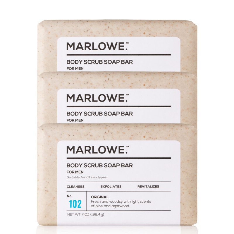 MARLOWE. No. 102 Men's Body Scrub Soap 7 oz (3 Bars) Fresh Original Woodsy Scent, Best Exfoliating Bar for Men, Natural Ingredients, Apricot Seed Powder, Shea Butter, Olive Oil, Green Tea Extracts