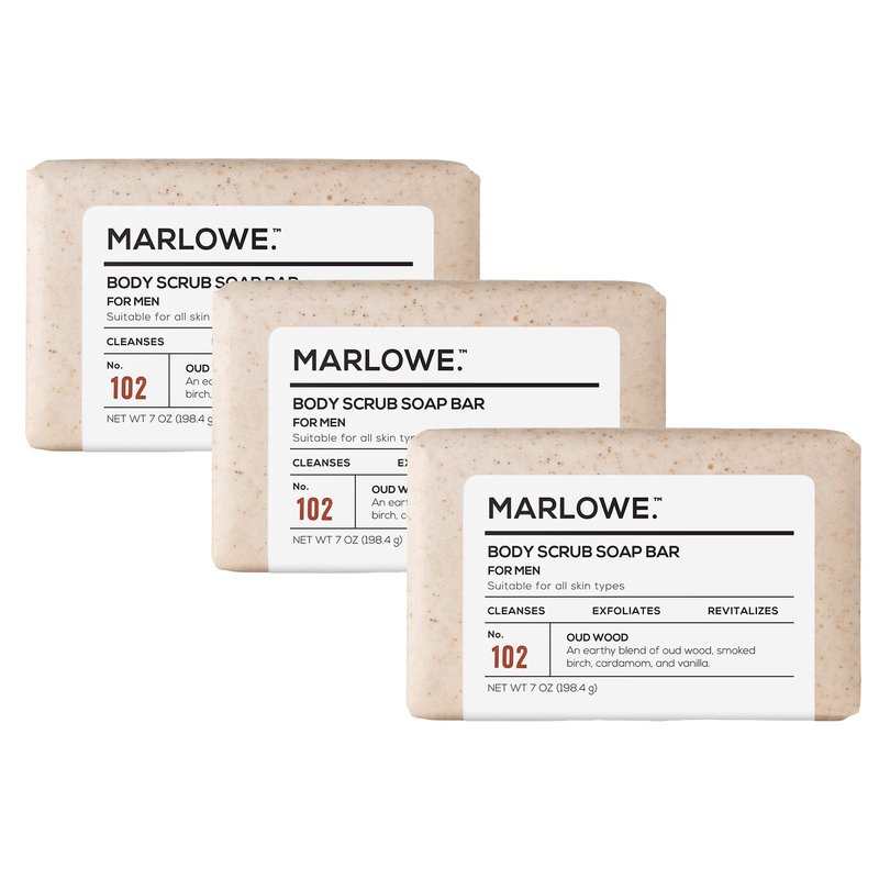 MARLOWE. No. 102 Men's Body Scrub Soap 7oz (3 Bars) Earthy Oud Wood Scent, Best Exfoliating Bar for Men, Made with Natural Ingredients, Apricot Seed Powder, Shea Butter, Olive Oil, Green Tea Extracts