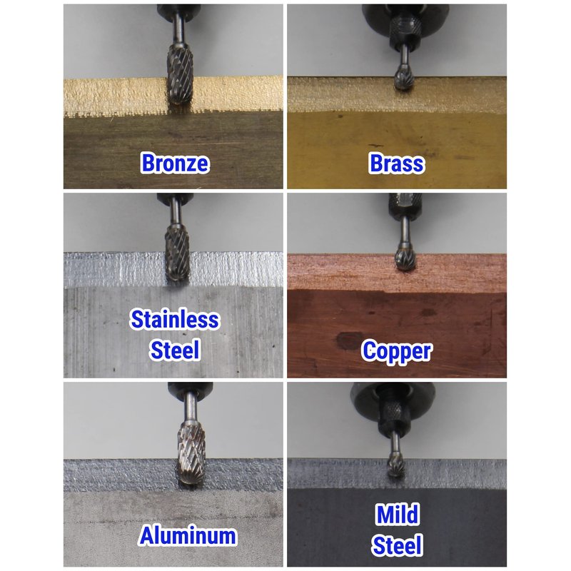 - Used for welds, steel, hardened steel, stainless steel, hard wood, balsa, wax, stone, slate, marble, granite, concrete, brass, copper, bronze, aluminum, cast-iron, cast-steel, nickel, titanium, zinc, porcelain, fiberglass, plastic, rubber, etc.